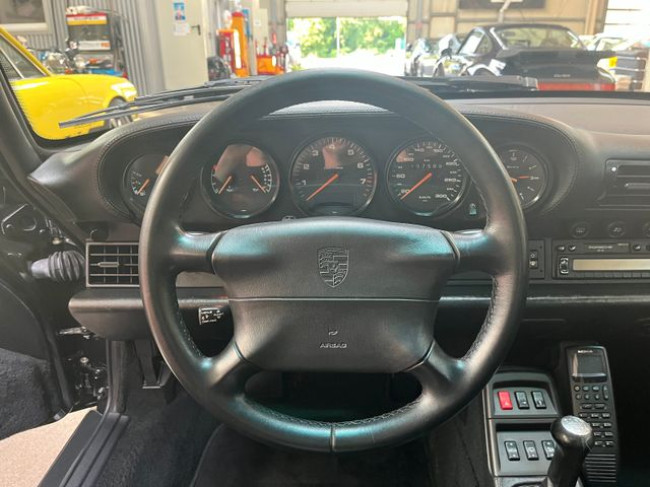 Porsche 993 Carrera 4S aus deutscher Auslieferung in schwarz mit schwarzer Innenausstattung. Der Wagen wurde am 09.05.1997 im Porsche Zentrum München am Olympiapark mit folgender Mehrausstattung ausgeliefert: regelbare Sitzheizung links und rechts, Lordosenstütze links, 3. Bremsleuchte in Dachblende, Entfall Telefonanlage, elektrisches Schiebedach, CD-Wechsler „Porsche CDC-3“. Das Fahrzeug wurde in unserer Werkstatt nahezu komplett überholt. Mechanisch lief es vor der Revision einwandfrei, hatte aber die üblichen Motorundichtigkeiten, sodass wir uns entschlossen haben, eine komplette Motorrevision durchzuführen mit allem, was dazu gehört. Hierüber gibt es auch eine Fotodokumentation. Unter anderem wurden bei uns die Kupplung, Lichtmaschine und der Motorkabelstrang erneuert. Des Weiteren wurden auch die Querlenker getauscht sowie die Spurstangen und Stabigehänge sowie viele andere umfangeiche Arbeiten erledigt. Zuvor wurde schon ein Bilstein Fahrwerk verbaut und die Bremsanlage komplett überholt. Vor der Auslieferung bekommt der Wagen noch wegen Überalterung einen Satz neue Reifen. Über die letzten Jahre wurde das Fahrzeug kaum bewegt. Nach den von uns durchgeführten Arbeiten können wir dem Käufer ein unfallfreies Fahrzeug in technisch und optisch sehr gutem Zustand übergeben. Auch hier erhält der Käufer bei uns ein Jahr Garantie auf das gesamte Auto gemäß unseren Garantiebedingungen.