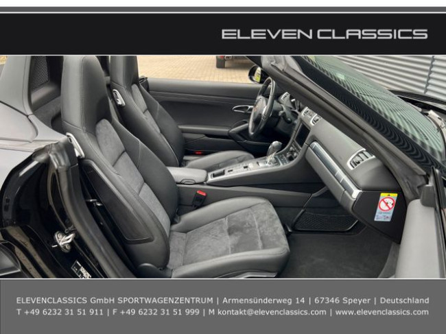 Airbag Fahrer-/Beifahrerseite, Antischlupfregelung (ASR), Außenspiegel asphärisch, links, Außenspiegel elektr. verstell- und heizbar, beide, Bordcomputer, Einschaltautomatik für Fahrlicht, Heckscheibe heizbar, Innenraumfilter: Aktivkohlefilter (Geruchsfilter), Karosserie: 2-türig, Kopf-Airbag-System Porsche Side Impact Protection System (POSIP), Lenksäule (Lenkrad) verstellbar, Motor 2,7 Ltr. - 195 kW KAT, Motor-Schleppmoment-Regulator (MSR), Parkbremse elektrisch, Reifen-Reparaturkit, Schadstoffarm nach Abgasnorm Euro 6, Seitenairbag vorn, Sitzbezug / Polsterung: Alcantara / Kunstleder, Sportsitze, Start/Stop-Anlage, Universal-Schnittstelle Audio, Verdeckbetätigung elektrisch, Verglasung getönt.